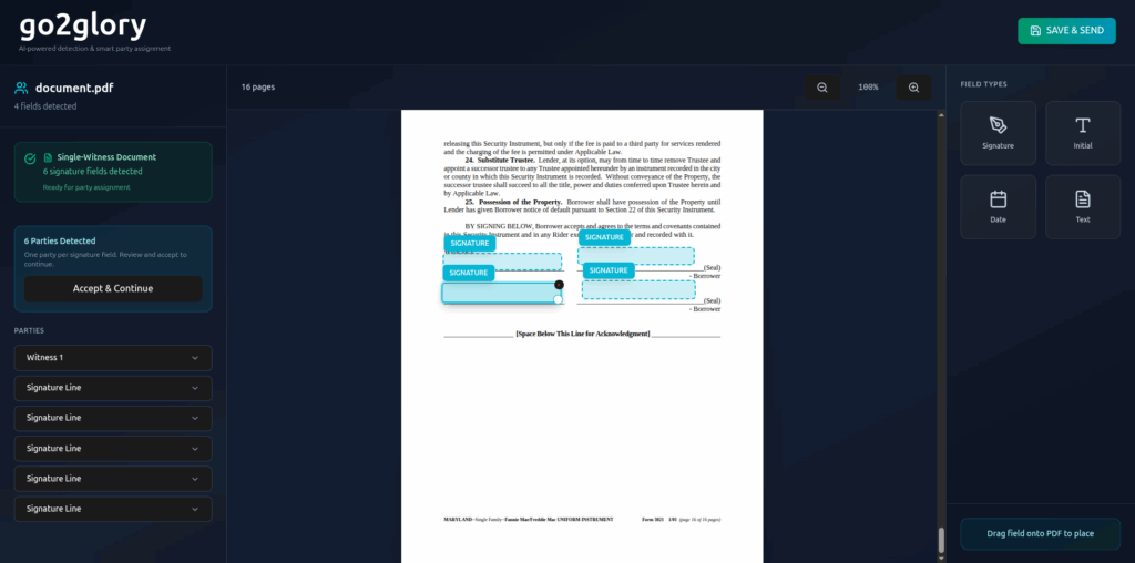 Our AI technology scans uploaded documents and identifies signature requirements automatically. No manual field placement needed – just upload, review the AI’s suggestions, and send.